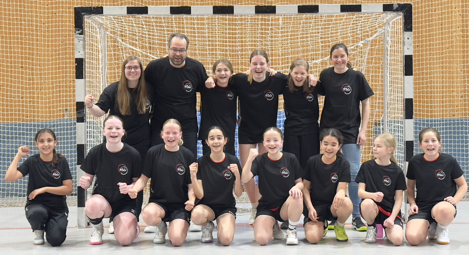 Nach den Shakehands mit den Gegnerinnen aus Oberhessen und der Entgegennahme der Ovationen durch die eigenen Fans gab es dann mit den speziell designten Meiserschafts-Shirts eine erste Überraschung. Das die Feierlichkeiten eher zurückhaltend ausfielen, hatte zum einen mit Überraschung 2 zu tun (Auflösung folgt gleich) und damit, dass Tia und Louisa als Teil der männlichen/ gemischten D-Jugend nach Seligenstadt zum ebenfalls letzten Saisonspiel mussten, das um 14 Uhr startete.