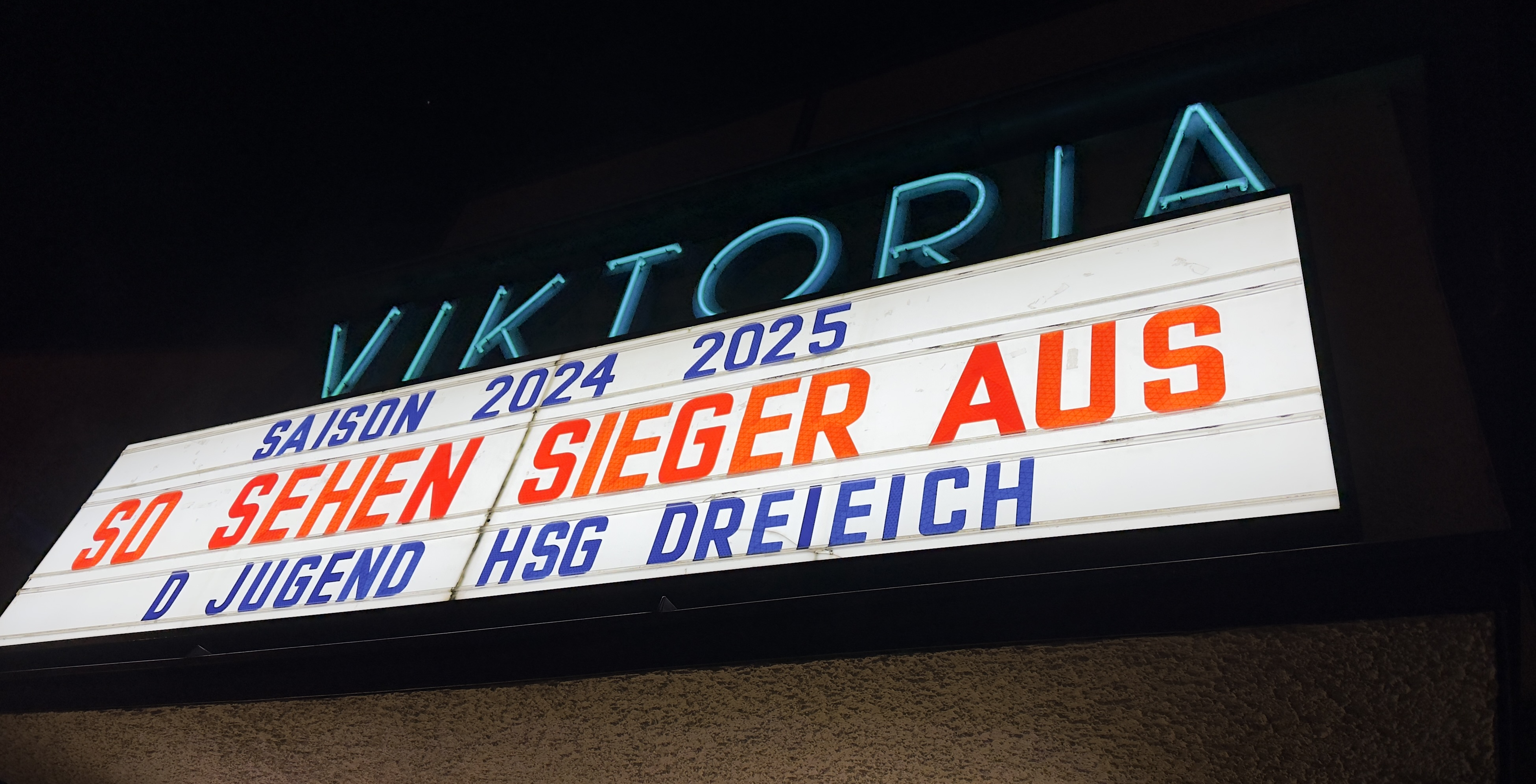 Aber zurück zur Auflösung der Überraschung #2 – um 17 Uhr trafen sich die beiden D-Jugend Meisterteams in ihren neuen Meister-Shirts noch immer relativ ahnungslos vor dem Filmtheater Viktoria im Herzen von Sprendlingen aber anhand der Kino-Leuchtreklame war dann klar, wie der Abend weitergehen sollte. Unter dem Motto „So sehen Sieger aus – D-Jugend HSG Dreieich“ wurde das gesamte Kino für die – das kann man bereits mit einem Tag Abstand sagen – legendäre und in die Annalen der HSG eingehende Meisterschaftsfeier gemietet. Nachdem man sich gemeinsam beim neuesten Minion-Film amüsierte, gab es Pizza, Kuchen und Snacks bevor ein unvergesslicher Partyabend begann. Am Ende feierten ca. 100 Gäste – Spieler und Spielerinnen, Geschwister und Eltern, Trainer und Betreuer – ausgelassen, singend und tanzend diese Doppelmeisterschaft.